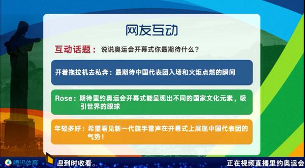 腾讯在里约同时派出的上百人直播团队,从奥运场馆周边、奥运新闻中心、运动员驻地、里约的街头巷尾多个角度实时输送现场画面。后方演播室则由柯凡主持,同时邀请到中国首位奥运旗手王立彬和著名篮球评论员杨毅作为嘉宾主持,在开幕式前与里约连线,解读中国奥运代表团的诸多看点,以及开幕式的种种猜想,并与网友实时互动。随后,腾讯又将开幕式全程精彩画面带给用户,从场内场外完整地直播了里约奥运开幕式的方方面面。可以说这是国内互联网媒体,第一次将奥运会开幕式通过全景直播形式,完整地呈献给中国的亿万用户。同时,腾讯也引领了以奥运会为代表的大事件进入全民直播时代。