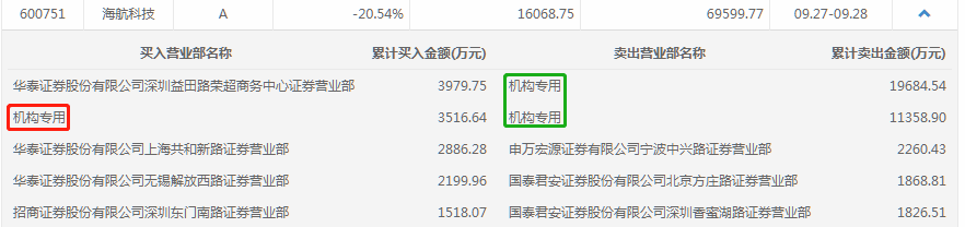 从详细数据看,机构卖出最多的海航科技有2家机构卖出,同时有1家机构买入,净卖出金额高达2.75亿元。