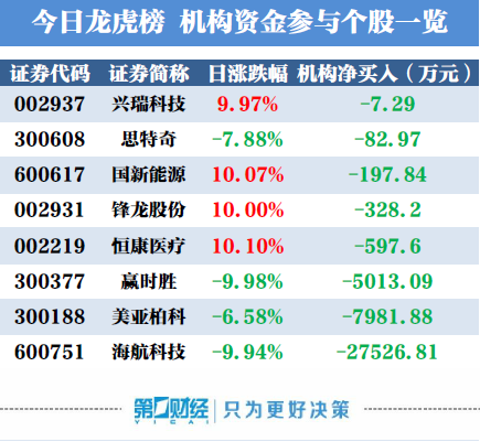 当天机构净卖出前三的股票分别是海航科技、美亚柏科、赢时胜,净流出金额分别是2.75亿元、7981万元、5013万元。