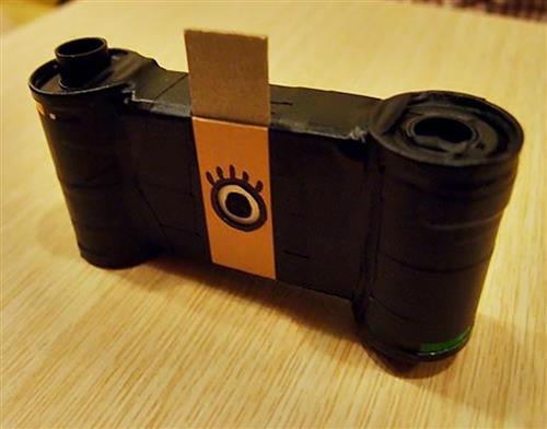 14 将这个塑胶环黏在全新底片的底部,并将尖处卡在底片的孔。请注意,这个塑胶环还请务必对齐下排的孔,因为到时候你在转底片时才会有转动的声音,才好判断是否已经将底片转到下一张了。算一下曝光的格数大约是7格左右,建议卷8~9格,避免重复曝光。