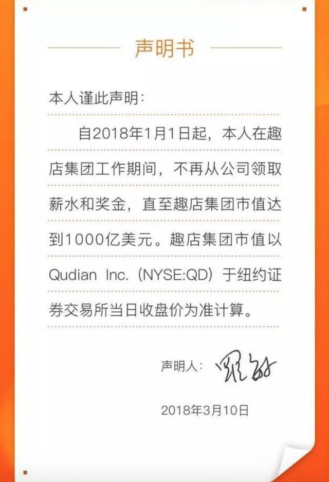 36氪讯,趣店CEO罗敏今日在其个人微信公众号上发布文章称,在公司市值达到1000亿美元之前,将不再从公司领取一分钱薪水和奖金。据悉,该计划已于3月10日得到董事会薪酬委员会的批准。