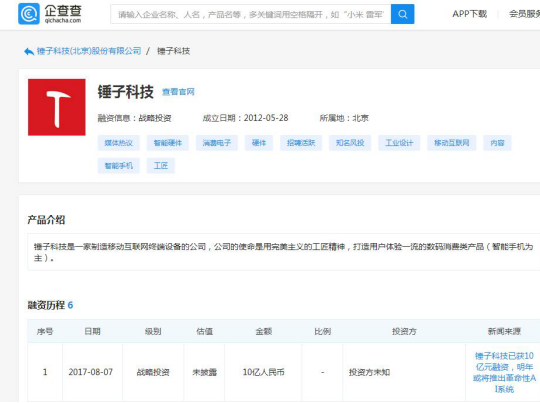 ,已于8月20日晚在锤子科技官方商城、锤子科技京东官方旗舰店同步首发。企查查显示,锤子科技成立于2012年,共经历了6轮融资。