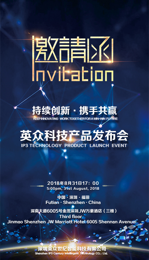 记者日前获悉,深圳英众世纪智能科技有限公司产品发布会,将于2018年8月31日下午17:00在金茂深圳JW万豪酒店举行。届时,来自消费类电子、电脑、通讯与工业控制领域的专家、嘉宾及五大媒体皆会到场,共襄盛举!