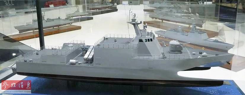 除新型三体护卫舰外,CSSC还公开展示了一种新型700吨级双体快速攻击舰(FAC)模型,双体舰设计类似中国海军现役的022型导弹艇的放大版,搭载76毫米舰炮、近防炮和多个反舰导弹发射器。