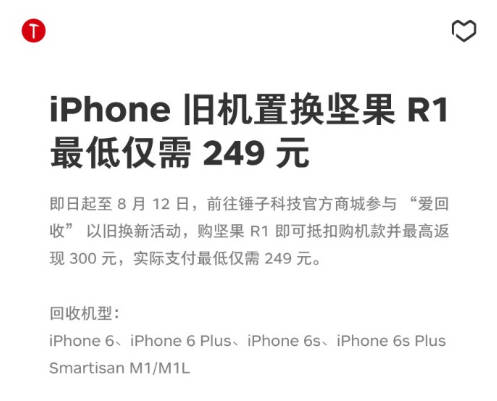 锤科宣布的这次iPhone旧机换坚果R1活动,自8月7日日起至8月12日结束,在锤子科技官方商城就能参与“爱回收手机回收置换”计划,购坚果R1即可抵扣购机款并最高返现300元,实际支付最低仅需249元。回收机型仅仅接受苹果旧手机和锤子自家的旧手机:iPhone 6、iPhone 6 Plus、iPhone 6s、iPhone 6s Plus、Smartisan M1/M1L。