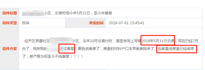 投诉者C:经开区芙蓉社区S小区,去年10月交首付时,草签合同上写着2018年5月31日交房,现在已经7月份了,我所购的房还没备案,更别说拿房了,房查的材料户口本早就拿回来了,也就是说房查已经结束了,房产局为何至今不给备案!