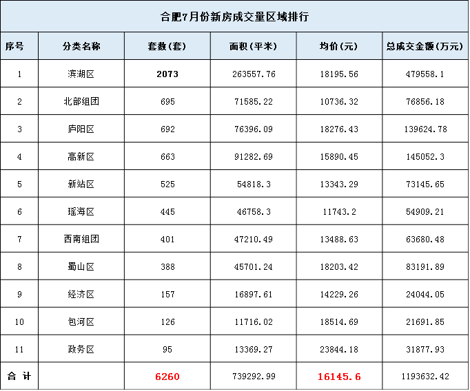 据金刚石数据统计,从7月1日—7月31日期间,合肥(九区+西南组团+北部组团)共备案6260套房源(包括高层、洋房、别墅和70年公 寓)。
