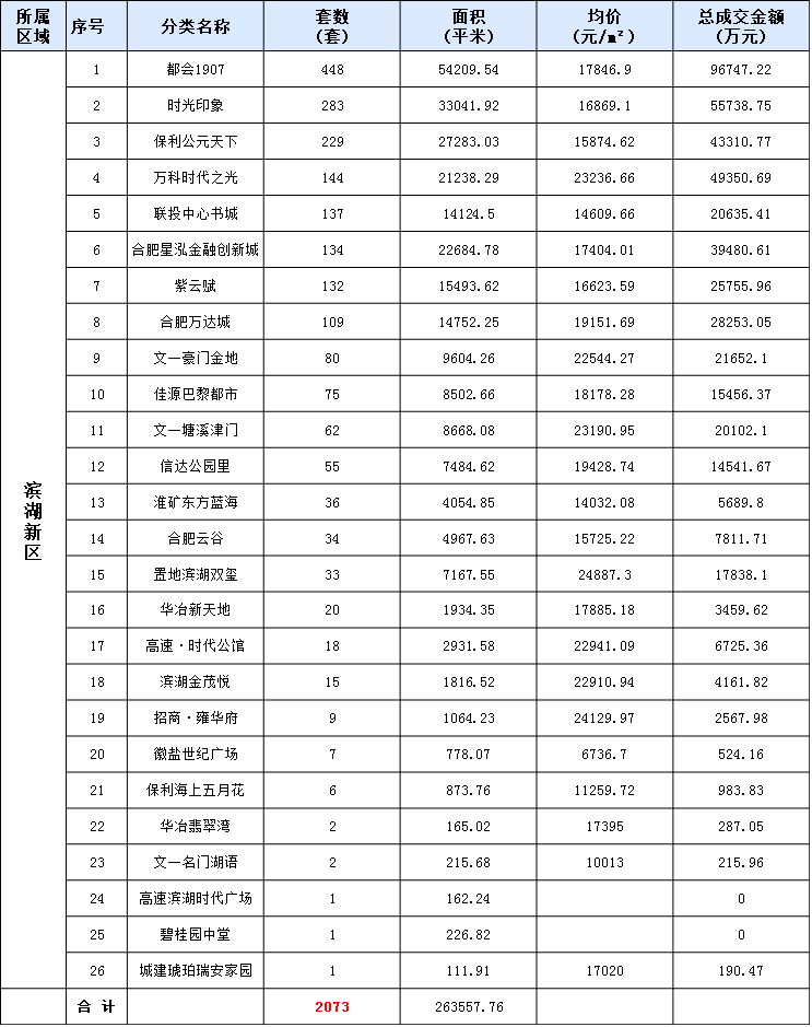 2、排在前几位的区域,除滨湖新区外,北部组团、庐阳区、高新区备案量分别在695套、692套、663套。相差不多,非常平均。