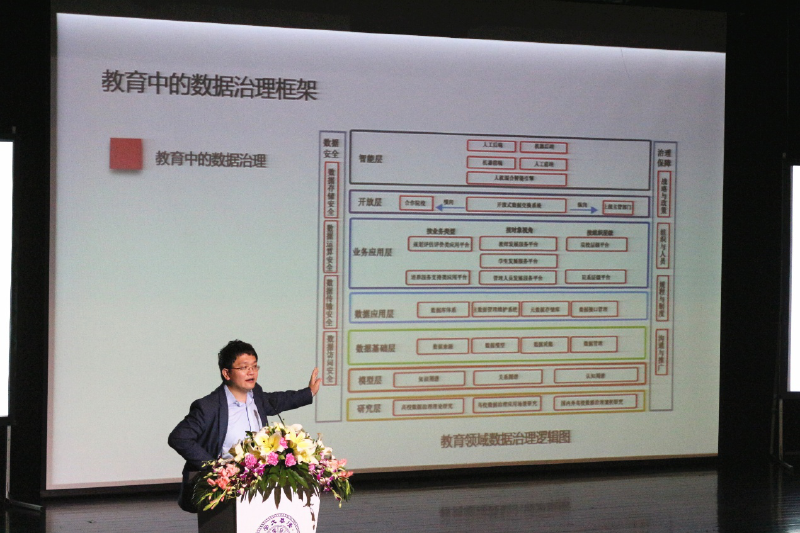 首先,王刚从数据治理的背景与意义出发,提出 “数据治理是解决和优化教育评价问题的基础”。接着指出数据治理的逻辑即是发现需求——解决问题——进而传递价值,以此逻辑构建数据治理的框架,实现数据治理的价值。王刚还为大家带来了数据治理在教育中应用的“8+1”原则,“1”即为有常识,他指出探索新领域时,不是二维问题,非此即彼,而是拓宽未知领域,区分问题、理想与现实等。原则“8”分别为:顶层设计,统一底层画像、标准与分类,数据分离,需求导向,化整为零,小步快走、主动迭代,用户视角,遵循数据供应链。最后,王刚提出在教育评价中落实数据治理中最主要的是科技辅佐教育的发展,打通对教育的理解,其本质上是由办公自动化到科技与教育的融合。