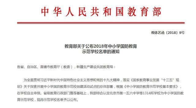 近日,教育部印发《关于公布2018年中小学国防教育示范学校名单的通知》,认定北京市第一五六中学等1314所学校为“中小学国防教育示范学校”。