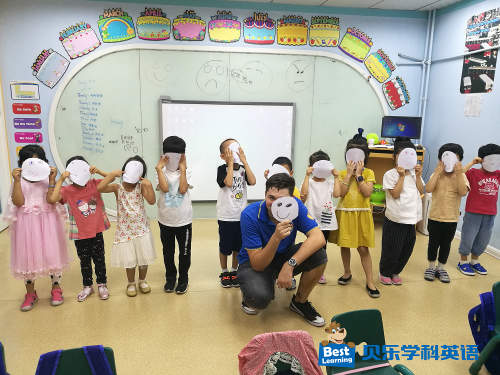 在学到情绪单元时,外教让小朋友们根据自己的心情制作了一张表情面具,运用刚学的新单词,练习整句输出:“I am happy.”让学员在玩中学,在学中用。