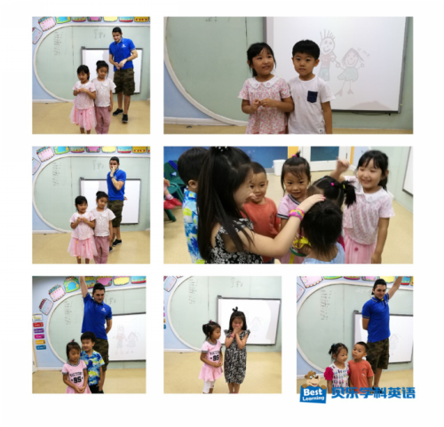 讲到tall和short这两个单词,Conor老师先让两个小朋友们站在台上比身高,其余小朋友们回答谁个子更高,小Ella和Kiki身高则不相上下,小朋友们争先恐后地跑上前去摸着她们的脑袋去对比,Amy说:“Kiki is taller than Ella.”情景中学习运用句子,学习瞬间变得更有趣了。