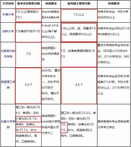 我们来看看英国这几所世界级的顶尖大学的雅思分数要求,就连本科都要求雅思在7分以上,更别提研究生了。