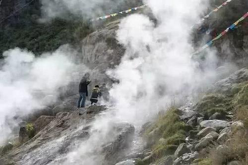 上行8公里处,阵阵热气扑面而来,这就是四川省地热资源第一的措普沟热坑地热田。大大小小的泉眼形态各异,散落在山坡上、公路旁、悬崖下、河水边。整个山谷都弥漫着温泉的气息,一股股热气从泉眼中升腾而起,那热气忽淡忽浓、忽明忽暗,在阳光的照射下,不停地变幻着迷人的色彩。据同行人介绍,热坑泉水水温高,富含矿物质,对皮肤病、风湿病等有特殊的疗效。温泉中,最独特、最壮观的莫过于远近闻名的三口间歇泉。由于时间关系,我未能一睹三口间歇泉的风采,不过站在水温稍微适宜的热坑泉水前,也领略到了此地温泉的神奇。