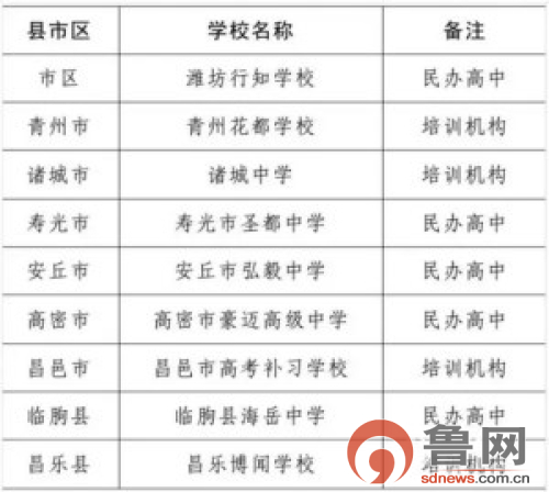 为切实维护普通高中正常的教育教学秩序,进一步规范办学行为,近日潍坊市教育局发出通知,公布了潍坊市9家批准接收高考复读生民办高中(培训机构)名单。