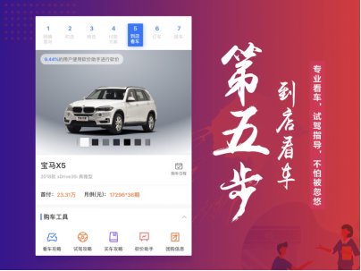 第五步到店看车,让用户能得到专业试驾指导,看车不怕被忽悠。首次到店看车,用户往往会遇到该去哪家4s店去看?看车应该看什么?如何试驾?等一系列难题。到店看车打通线上选车到线下看车的完整流程,通过专业工具提供4s店口碑评价,看车攻略和试驾攻略,让用户在线下看车前了解过更多专业知识,辅助用户到店决策全过程。
