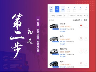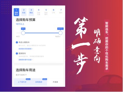 第一步明确意向,智能选车,挖掘你的个性化购车需求。针对用户在挑选中遇到的品牌车系太多、新车难选,缺乏选车场景等现实情况,七步购车智能选车工具,按照购车用途、场景、预算、乘车人数、配置等,来帮用户轻松确认购车需求。