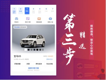 第四步付款方案,多样付款方案,轻轻松松买车还贷。当前汽车销售市场,缺乏厂商金融信息展示,用户对金融政策根本不了解,而在分期方案中推荐金融产品,无疑为买车用户赋能和加速决策上注入了一剂强心针。该步骤通过厂商的金融政策把控,为用户提供金融+保险方案,并测定贷款额,优化用户使用路径,设计最优车选,原本用户心理预期是购买10万的车,结果通过金融方案实现较少首付,可购买20w以上的车辆。金融方案帮助用户洞悉厂商政策,让买车用户将钱花在刀刃上,买到最好的车。