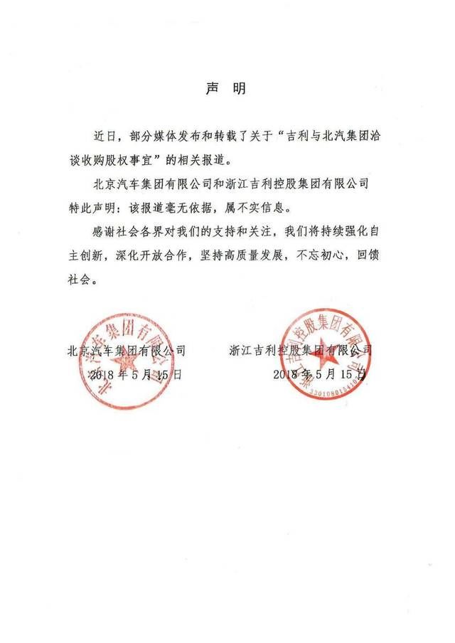 对于以上信息,北汽集团董事长徐和谊、奇瑞汽车董事长尹同跃分别以“胡说八道”回应;北汽集团与吉利控股联合发布声明,表示“该报道毫无根据,属不实消息”;奇瑞汽车则单独发布声明,“目前任何此类传言都不属实”。野马汽车相关负责人也回应称:“富临集团和广西汽车集团只是达成了战略合作意向协议,并没有谈及收购事宜。”