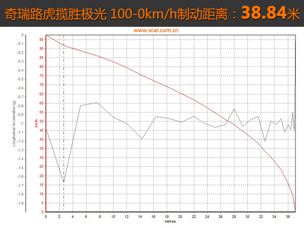 相比起加速来说,增加的车重同样没有影响到国产极光的制动水平。其百公里制动距离为38.84米。对于1.85吨的车重来说,这样的成绩比较优秀。整个制动过程比较线性,制动力度释放也很均匀。