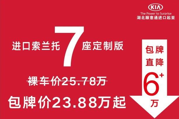 迎新特惠季,买车就要唯“索”欲为!进口索兰托L汽油2.4L四驱定制版官方裸车价25.78万,本店“三包”落地价23.88万起,包购置税、包交强险、包过户,新车所有手续本店一律免费代办,让您轻松购车,乐享精彩生活。车源仅剩12台,厚惠无欺,抓紧致电抢购吧! !!!
