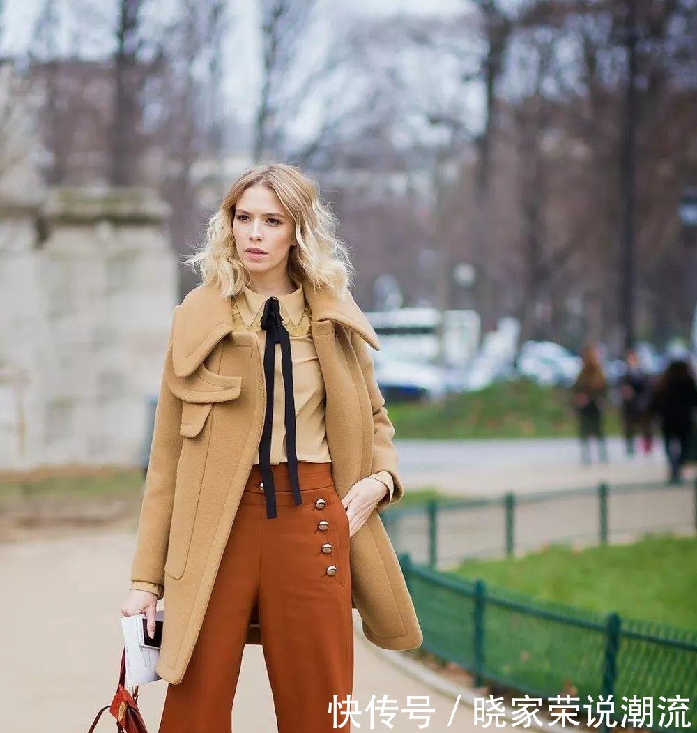 驼色是一种大气的颜色,所以用驼色的大衣来搭配阔腿裤会更加的有气质。高腰的土橘色阔腿裤,还能够把你的腿部无限拉长。还可以遮住不完美的腿型,让你显瘦又时尚。在穿着一双高跟鞋,整个的色调不会特别的复杂,展现复古干练的都市造型,同时气场十足。