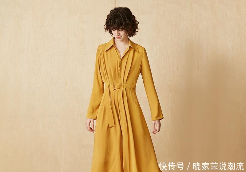 透露出一股子闲适的法式文艺腔调,十分优美的雪纺裙子,温暖明丽的姜黄色,上身即为浪漫优雅的都市女郎,而且很衬肤色显白。轻薄的丝滑面料,贴身穿着也舒适。秋冬作为打底,外套深色的长款大衣,轻松点亮整体装扮。