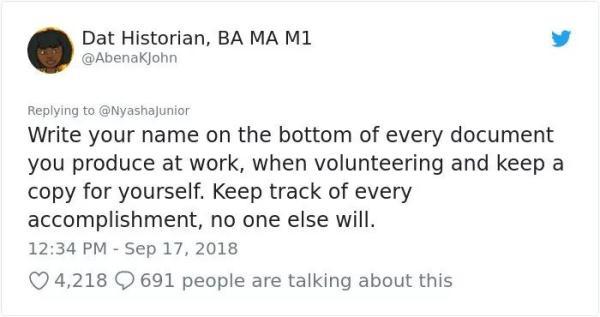 作家、大学教授Nyasha Junior女士在推特上发了一个帖子,征询40多岁的女性,她们会给20多岁的自己哪些建议。